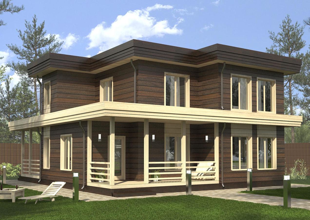 Уютный типовой проект деревянного модульного дома комфорт класса. Коттедж имеет большую гостиную, просторную кухню-столовую, 4 вместительные спальни и 2 ванные комнаты.